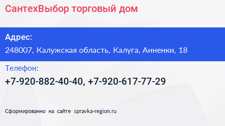 СантехВыбор, торговый дом по адресу 248007, Калужская область, Калуга, Анненки, 18 в дальнейшем Организация, размещена в следующих категориях: