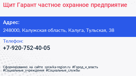 Щит-Гарант, частное охранное предприятие по адресу 248000, Калужская область, Калуга, Тульская, 38 в дальнейшем Организация, размещена в следующих категориях: