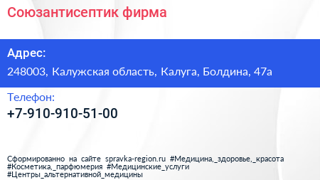 Союзантисептик, фирма по адресу 248003, Калужская область, Калуга, Болдина, 47а в дальнейшем Организация, размещена в следующих категориях:
