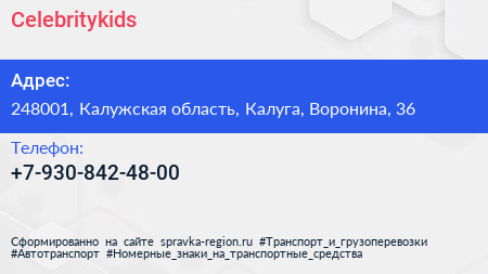 Celebritykids по адресу 248001, Калужская область, Калуга, Воронина, 36 в дальнейшем Организация, размещена в следующих категориях:
