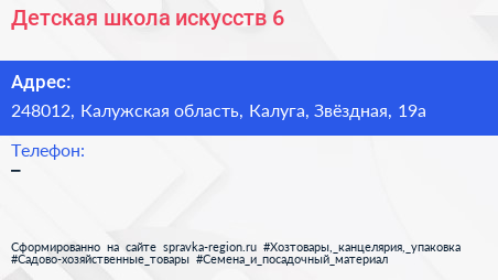 Детская школа искусств №6 по адресу 248012, Калужская область, Калуга, Звёздная, 19а в дальнейшем Организация, размещена в следующих категориях: