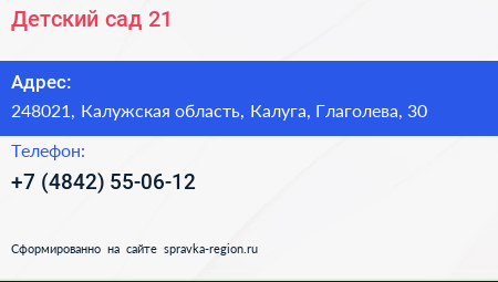 Детский сад №21 по адресу 248021, Калужская область, Калуга, Глаголева, 30 в дальнейшем Организация, размещена в следующих категориях: