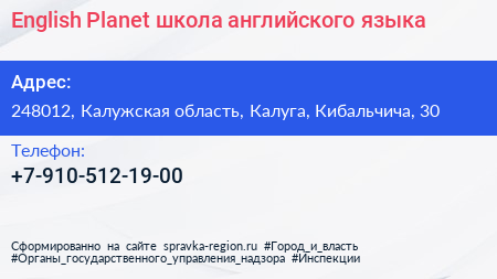English Planet, школа английского языка по адресу 248012, Калужская область, Калуга, Кибальчича, 30 в дальнейшем Организация, размещена в следующих категориях: