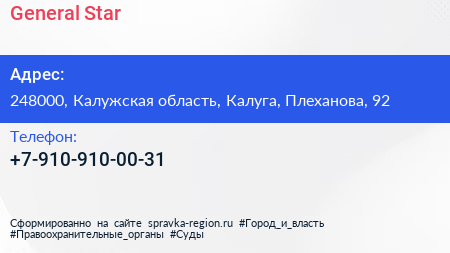 General Star по адресу 248000, Калужская область, Калуга, Плеханова, 92 в дальнейшем Организация, размещена в следующих категориях: