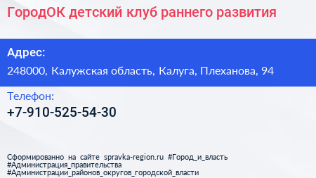 ГородОК, детский клуб раннего развития по адресу 248000, Калужская область, Калуга, Плеханова, 94 в дальнейшем Организация, размещена в следующих категориях: