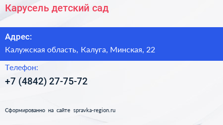 Карусель, детский сад по адресу Калужская область, Калуга, Минская, 22 в дальнейшем Организация, размещена в следующих категориях: