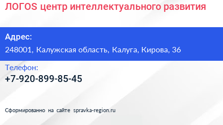 ЛОГОS, центр интеллектуального развития по адресу 248001, Калужская область, Калуга, Кирова, 36 в дальнейшем Организация, размещена в следующих категориях: