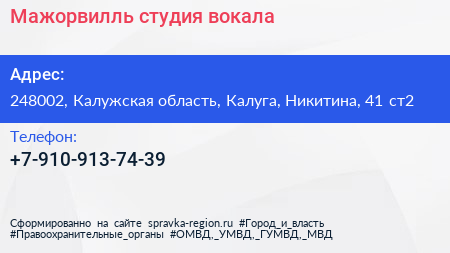 Мажорвилль, студия вокала по адресу 248002, Калужская область, Калуга, Никитина, 41 ст2 в дальнейшем Организация, размещена в следующих категориях: