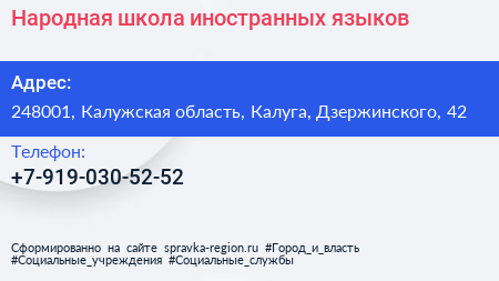 Народная, школа иностранных языков по адресу 248001, Калужская область, Калуга, Дзержинского, 42 в дальнейшем Организация, размещена в следующих категориях: