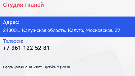 Студия тканей по адресу 248001, Калужская область, Калуга, Московская, 29 в дальнейшем Организация, размещена в следующих категориях: