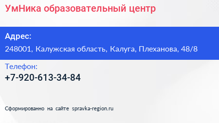 УмНика, образовательный центр по адресу 248001, Калужская область, Калуга, Плеханова, 48/8 в дальнейшем Организация, размещена в следующих категориях: