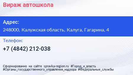 Вираж, автошкола по адресу 248000, Калужская область, Калуга, Гагарина, 4 в дальнейшем Организация, размещена в следующих категориях: