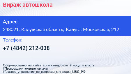 Вираж, автошкола по адресу 248021, Калужская область, Калуга, Московская, 212 в дальнейшем Организация, размещена в следующих категориях:
