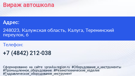 Вираж, автошкола по адресу 248023, Калужская область, Калуга, Теренинский переулок, 6 в дальнейшем Организация, размещена в следующих категориях: