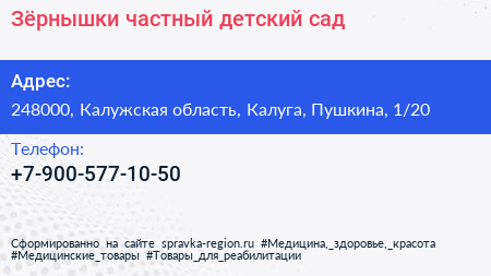 Зёрнышки, частный детский сад по адресу 248000, Калужская область, Калуга, Пушкина, 1/20 в дальнейшем Организация, размещена в следующих категориях: