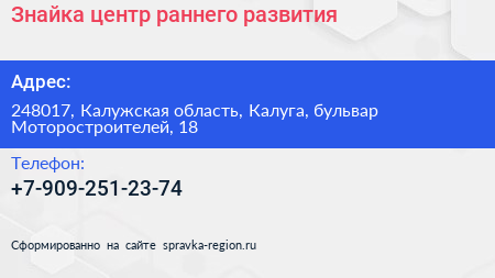 Знайка, центр раннего развития по адресу 248017, Калужская область, Калуга, бульвар Моторостроителей, 18 в дальнейшем Организация, размещена в следующих категориях: