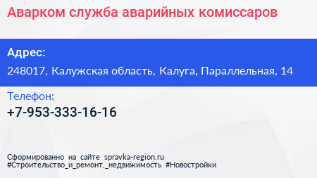 Аварком, служба аварийных комиссаров по адресу 248017, Калужская область, Калуга, Параллельная, 14 в дальнейшем Организация, размещена в следующих категориях: