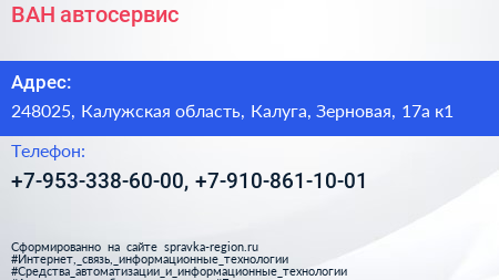 ВАН, автосервис по адресу 248025, Калужская область, Калуга, Зерновая, 17а к1 в дальнейшем Организация, размещена в следующих категориях: