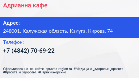 Адрианна, кафе по адресу 248001, Калужская область, Калуга, Кирова, 74 в дальнейшем Организация, размещена в следующих категориях: