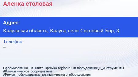 Аленка, столовая по адресу Калужская область, Калуга, село Сосновый Бор, 3 в дальнейшем Организация, размещена в следующих категориях: