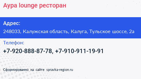 Аура lounge, ресторан по адресу 248033, Калужская область, Калуга, Тульское шоссе, 2а в дальнейшем Организация, размещена в следующих категориях:
