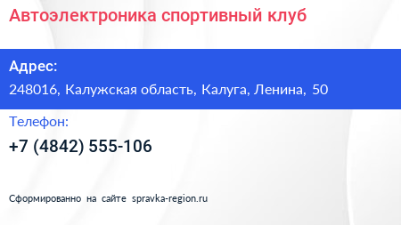 Автоэлектроника, спортивный клуб по адресу 248016, Калужская область, Калуга, Ленина, 50 в дальнейшем Организация, размещена в следующих категориях: