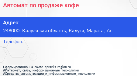 Автомат по продаже кофе по адресу 248000, Калужская область, Калуга, Марата, 7а в дальнейшем Организация, размещена в следующих категориях: