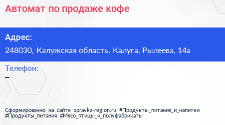 Автомат по продаже кофе по адресу 248030, Калужская область, Калуга, Рылеева, 14а в дальнейшем Организация, размещена в следующих категориях: