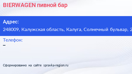 BIERWAGEN, пивной бар по адресу 248009, Калужская область, Калуга, Солнечный бульвар, 2 в дальнейшем Организация, размещена в следующих категориях: