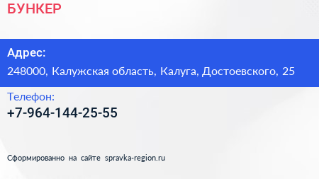 БУНКЕР по адресу 248000, Калужская область, Калуга, Достоевского, 25 в дальнейшем Организация, размещена в следующих категориях: