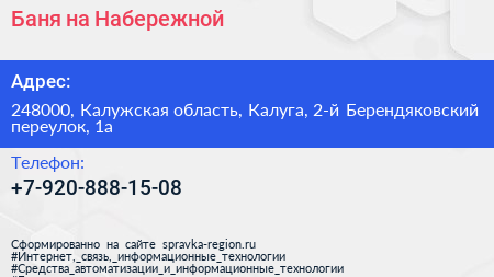 Баня на Набережной по адресу 248000, Калужская область, Калуга, 2-й Берендяковский переулок, 1а в дальнейшем Организация, размещена в следующих категориях:
