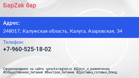 БарZak, бар по адресу 248017, Калужская область, Калуга, Азаровская, 34 в дальнейшем Организация, размещена в следующих категориях: