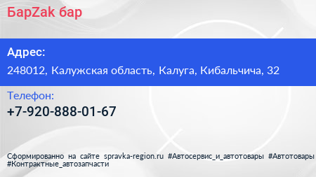 БарZak, бар по адресу 248012, Калужская область, Калуга, Кибальчича, 32 в дальнейшем Организация, размещена в следующих категориях: