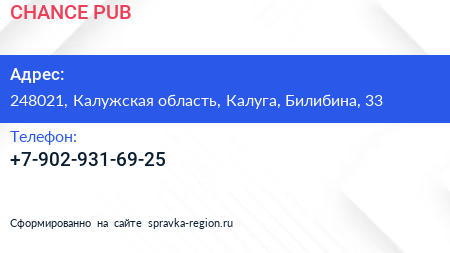 CHANCE PUB по адресу 248021, Калужская область, Калуга, Билибина, 33 в дальнейшем Организация, размещена в следующих категориях:
