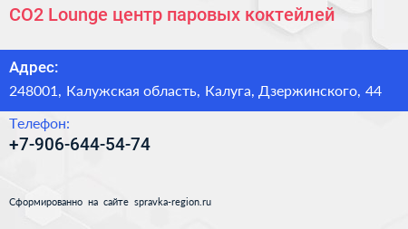 CO2 Lounge, центр паровых коктейлей по адресу 248001, Калужская область, Калуга, Дзержинского, 44 в дальнейшем Организация, размещена в следующих категориях:
