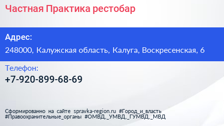 Частная Практика, рестобар по адресу 248000, Калужская область, Калуга, Воскресенская, 6 в дальнейшем Организация, размещена в следующих категориях: