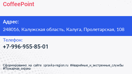 CoffeePoint по адресу 248016, Калужская область, Калуга, Пролетарская, 108 в дальнейшем Организация, размещена в следующих категориях: