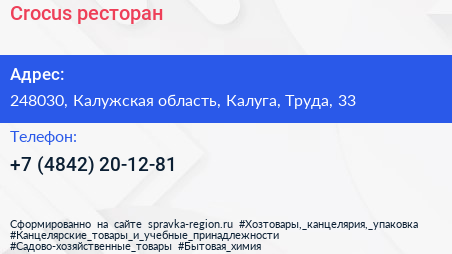Crocus, ресторан по адресу 248030, Калужская область, Калуга, Труда, 33 в дальнейшем Организация, размещена в следующих категориях: