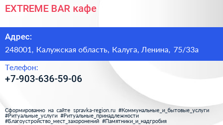 EXTREME BAR, кафе по адресу 248001, Калужская область, Калуга, Ленина, 75/33а в дальнейшем Организация, размещена в следующих категориях: