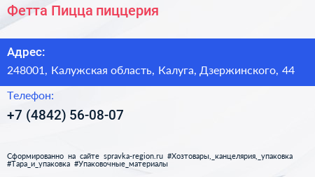 Фетта Пицца, пиццерия по адресу 248001, Калужская область, Калуга, Дзержинского, 44 в дальнейшем Организация, размещена в следующих категориях: