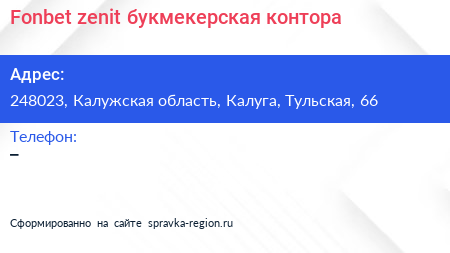 Fonbet zenit, букмекерская контора по адресу 248023, Калужская область, Калуга, Тульская, 66 в дальнейшем Организация, размещена в следующих категориях: