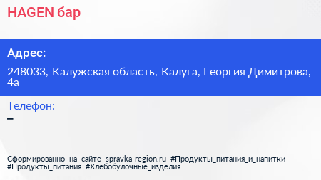 HAGEN, бар по адресу 248033, Калужская область, Калуга, Георгия Димитрова, 4а в дальнейшем Организация, размещена в следующих категориях: