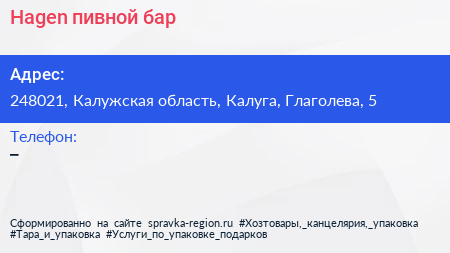 Hagen, пивной бар по адресу 248021, Калужская область, Калуга, Глаголева, 5 в дальнейшем Организация, размещена в следующих категориях: