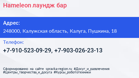 Hameleon, лаундж-бар по адресу 248000, Калужская область, Калуга, Пушкина, 18 в дальнейшем Организация, размещена в следующих категориях: