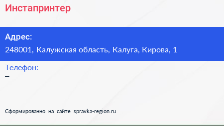 Инстапринтер по адресу 248001, Калужская область, Калуга, Кирова, 1 в дальнейшем Организация, размещена в следующих категориях: