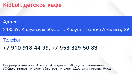 KidLoft, детское кафе по адресу 248039, Калужская область, Калуга, Георгия Амелина, 39 в дальнейшем Организация, размещена в следующих категориях: