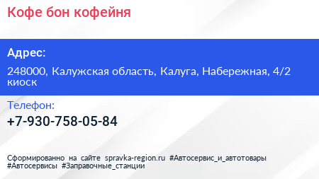 Кофе бон, кофейня по адресу 248000, Калужская область, Калуга, Набережная, 4/2 киоск в дальнейшем Организация, размещена в следующих категориях:
