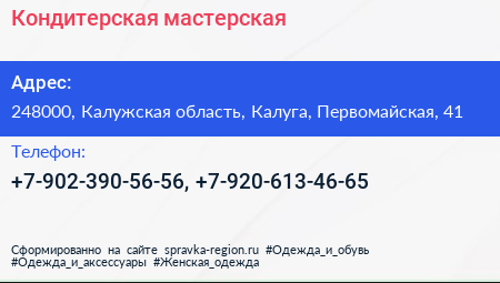 Кондитерская мастерская по адресу 248000, Калужская область, Калуга, Первомайская, 41 в дальнейшем Организация, размещена в следующих категориях: