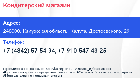 Кондитерский магазин по адресу 248000, Калужская область, Калуга, Достоевского, 29 в дальнейшем Организация, размещена в следующих категориях:
