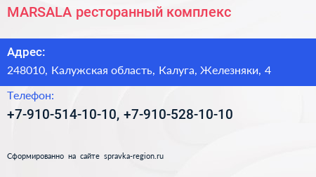 MARSALA, ресторанный комплекс по адресу 248010, Калужская область, Калуга, Железняки, 4 в дальнейшем Организация, размещена в следующих категориях: